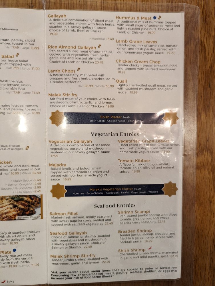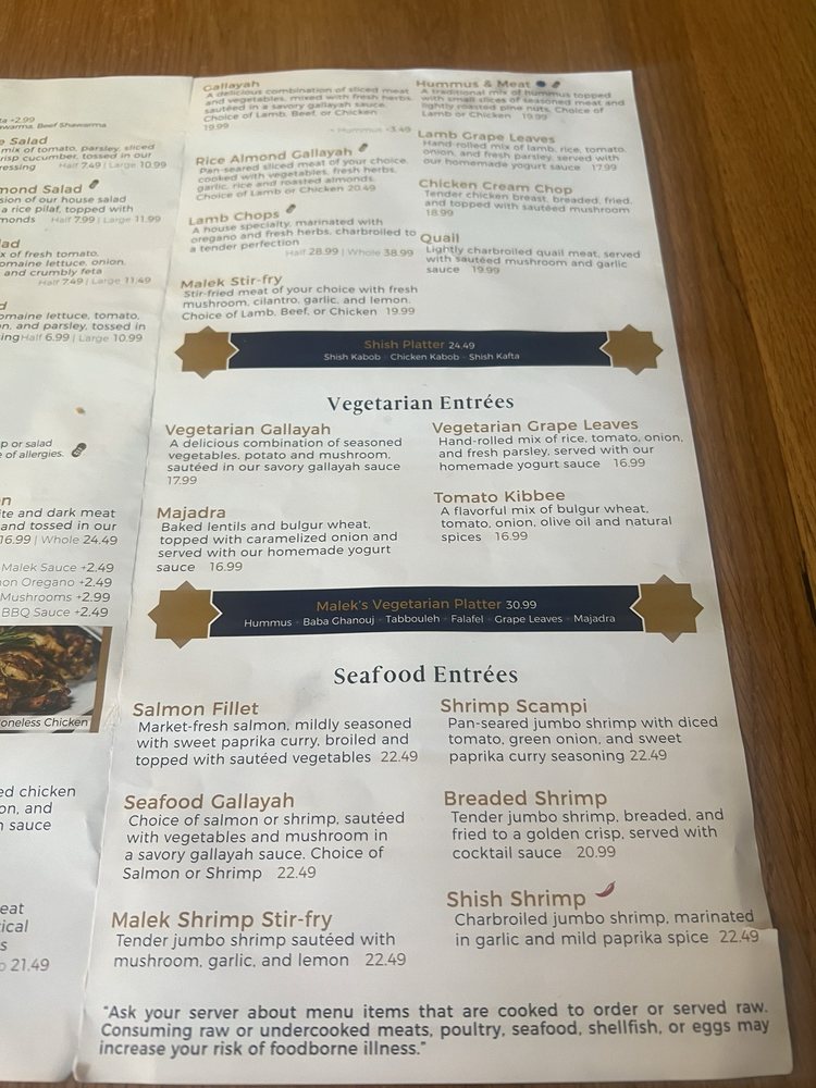 Introducing the menu at Malek Al Kabob - Dearborn, a Middle Eastern, Seafood, and Mediterranean fusion restaurant located in Dearborn, MI. The restaurant offers a wide range of utilities including reservations, delivery, takeout, and catering services. With a casual atmosphere and moderate noise level, Malek Al Kabob is perfect for groups, children, and dinner outings. The menu features a variety of delicious dishes, including traditional Middle Eastern kabobs, fresh seafood options, and flavorful Mediterranean dishes. The restaurant also offers happy hour specials, a full bar with alcohol options, and free Wi-Fi. With attentive waiter service, outdoor seating, and dog-friendly policies, Malek Al Kabob - Dearborn provides a welcoming and enjoyable dining experience for all.
